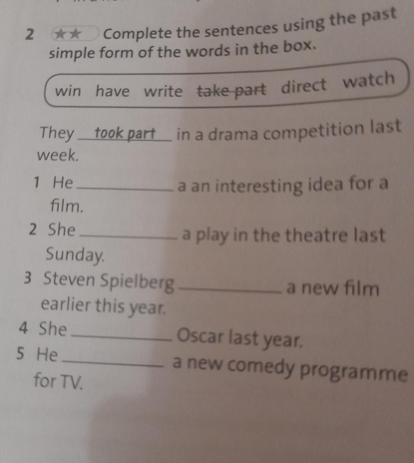 2 * Complete the sentences using the past simple form of the words in the box. win have write take part direct watch They took part in a drama competition last week. 1 Не a an interesting idea for a film. 2 She a play in the theatre last Sunday 3 Steven Spielberg a new film earlier this year. 4 She Oscar last year. 5 He a new comedy programme for TV.