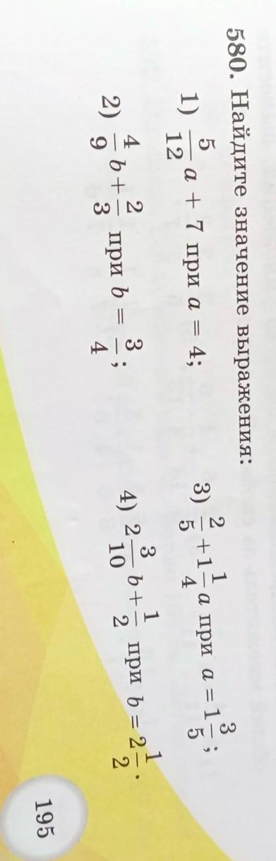 580. Найдите значение выражения: 5 1) а + 7 при а = 4; 12 а 3) 3 а при а = 1 2 3 3 1 b + при 6 b 4) 2 b + при b = 2 2 3. 10 4 19