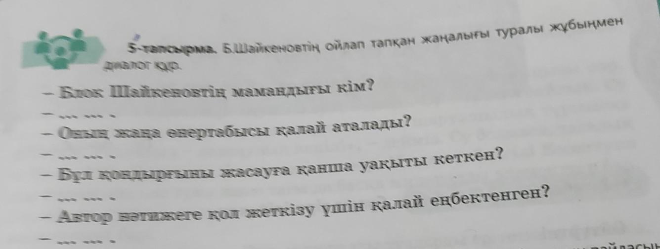 5-тапсырма. Б.Шайкеновтің ойлап тапқан жаңалығы туралы жұбыңмен диалог құр. Блок Шайкеновтің мамандығы кім? Оның жаңа өнертабысы қалай аталады? - – Бұл қондырғыны жасауға қанша уақыты кеткен? $$$ — Автор нәтижеге қол жеткізу үшін қалай еңбектенген?