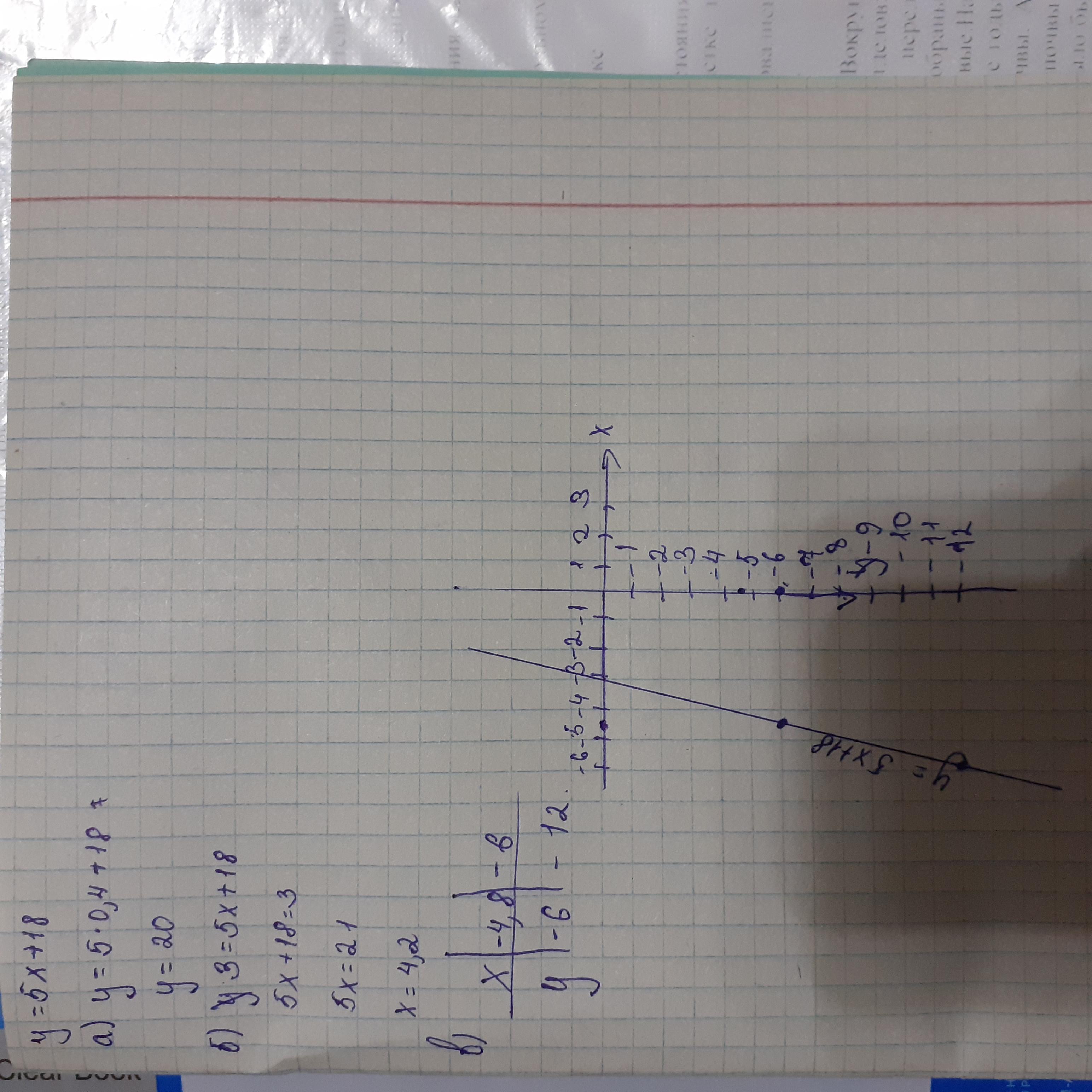 Функция задана формулой y=5x+18Определите: а) значение y, если x=0,4 б) значение x, при котором y=3 в) проходит ли график функции через точку с координатами (-6;-12) Если не сложно с графиком пж.