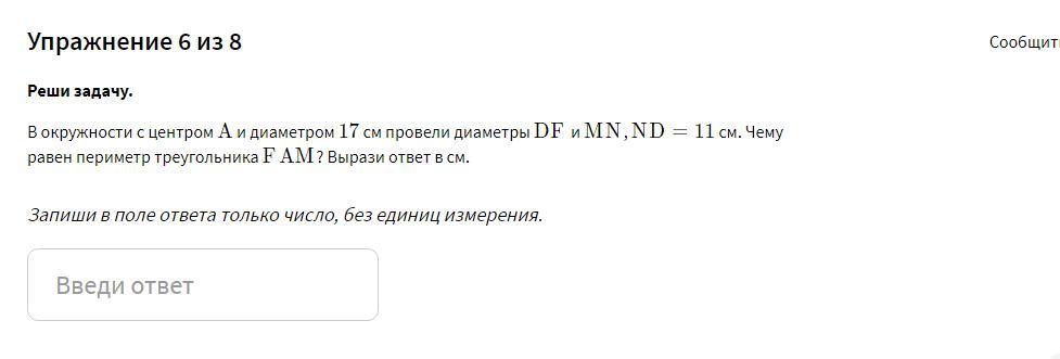 В окружности с центром AA и диаметром 17 17 см провели диаметры DFDF и MNMN , ND = 11 ND=11 см. Чему равен периметр треугольника FAMFAM ? Вырази ответ в см.