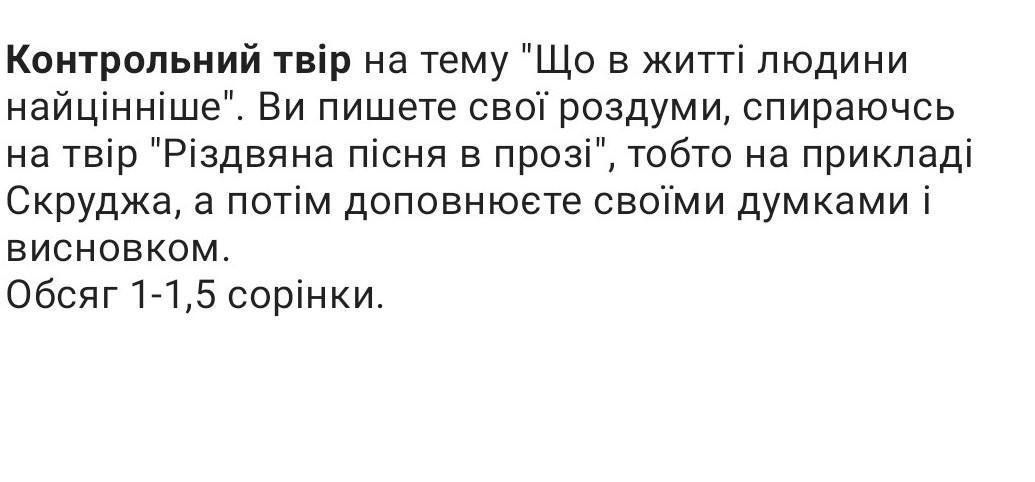 У Скруджа є все. Він багатий, у нього є торгова спілка, він вміє заробляти гроші. Справді, без грошей не буде і свята, бо ні за що буде купити подарунки чи накрити святковий стіл. Гроші дуже потрібні усім. Бідність та убогість дуже неприємні. У цьому творі Чарльз Діккенс показав, які потворні "Бідність" і "Темнота". Вони змальовані у вигляді маленьких діток, але діти ці потворні, зморщені, худі, обдерті. Ось така неприваблива бідність. Ніхто не хоче бути нещасним. Але Скрудж нічим не кращий за цих потвор. Він хоч і багатий, але поводиться, як бідний, бо економить на всьому, і в нього немає ні свята, ні подарунків. Справжнє щастя Скрудж пізнав, коли зумів зробити гарні справи. Подарував родині Боба великого індика, а сам відправився в гості до племінника. Він став посміхатися й робити добро. Від цього на душі в нього потеплішало, і Різдво стало його улюбленим святом. Мені здається, що найцінніше в житті — це наші рідні. Я хочу, щоб мої мама й тато, брат, бабуся, тітка були завжди здорові й посміхалися. Коли ми збираємося разом, навіть без подарунків, але з гарним настроєм — це найцінніше для мене. Добре, що Скрудж зрозумів свої помилки та встиг їх виправити.