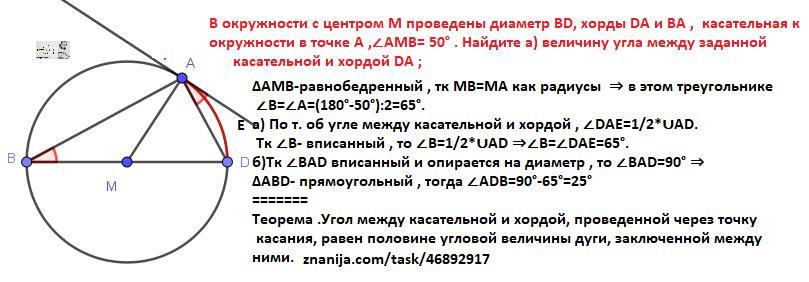 В окружности с центром М проведены диаметр BD, хорды DA и BA , касательная к окружности в точке A ,∠AMB= 50° . Найдите а) величину угла между заданной касательной и хордой DA ;
