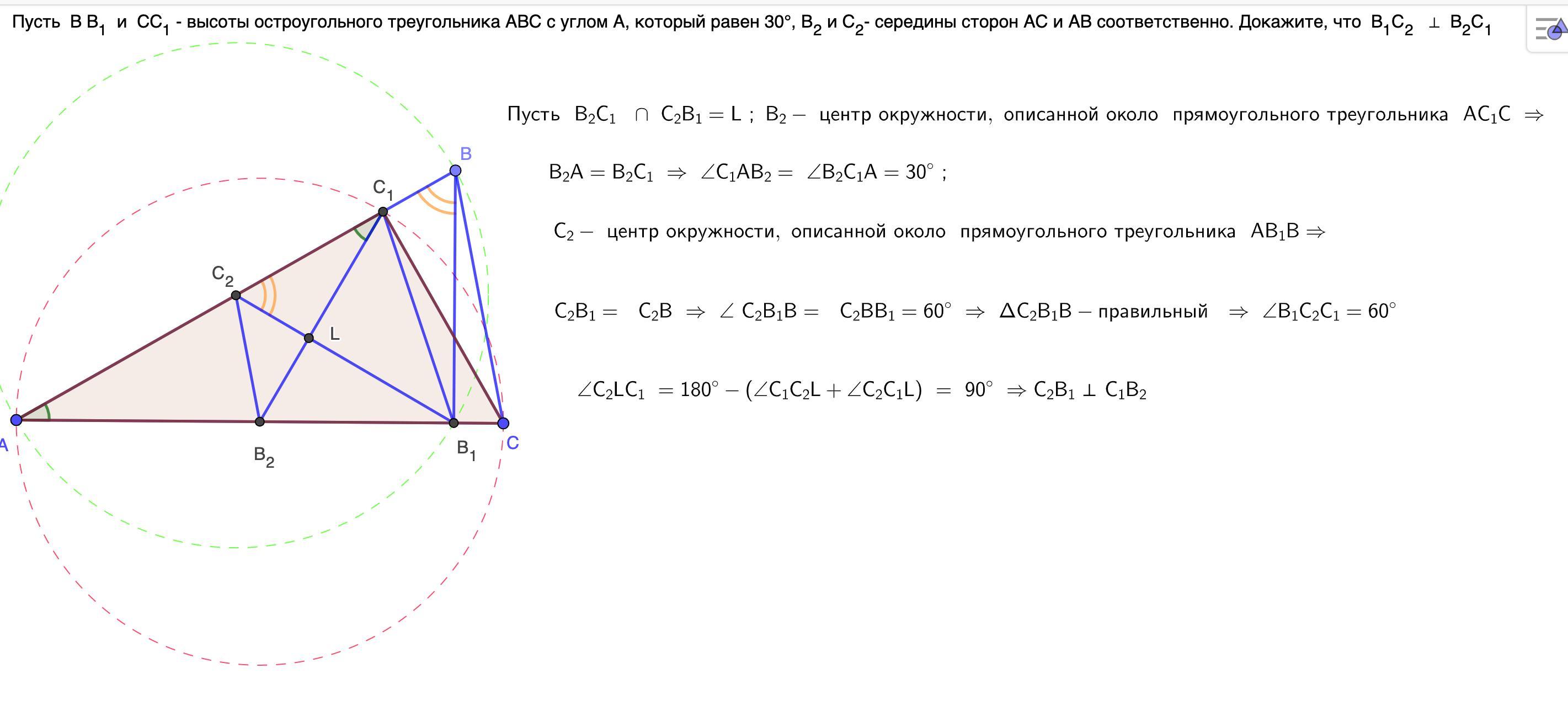 Пусть BB1 и CC1 - высоты остроугольного треугольника АВС с углом А, который равен 30°, В2 и С2 - середины сторон АС и АВ соответственно. Докажите, что отрезки В1С2 и В2С1 перепендикулярны