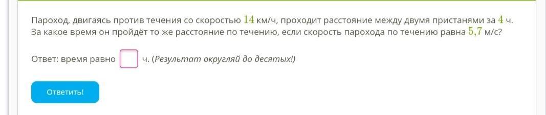 Пароход, двигаясь против течения со скоростью 14 км/ч, проходит расстояние между двумя пристанями за 4 ч. За какое время он пройдёт то же расстояние по течению, если скорость парохода по течению равна 5,7 м/с? Ответ: время равно ч. (Результат округляй до десятых!)