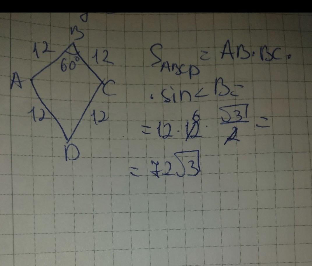 Сторона ромба равна 12 см, а угол между сторонами равен 60°(острый угол ромба). Найти высоту, обе диагонали и площадь ромба.