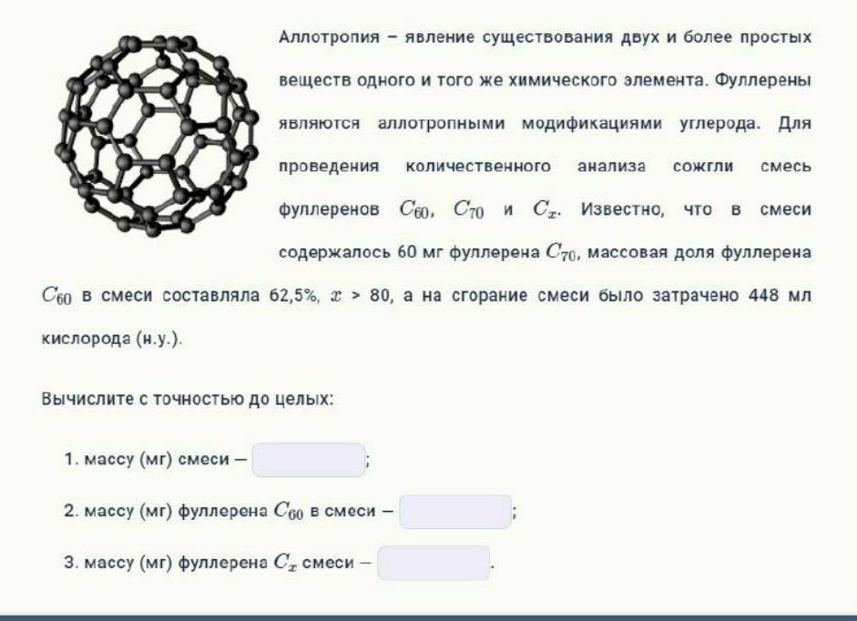 Аллотропия – явление существования двух и более простых веществ одного и того же химического элемента. Фуллерены являются аллотропными модификациями углерода. Для проведения количественного анализа сожгли смесь фуллеренов C60, C70 и Cx. Известно, что в смеси содержалось 60 мг фуллерена C70, массовая доля фуллерена C60 в смеси составляла 62,5%, x > 80, а на сгорание смеси было затрачено 448 мл кислорода (н.у.).
