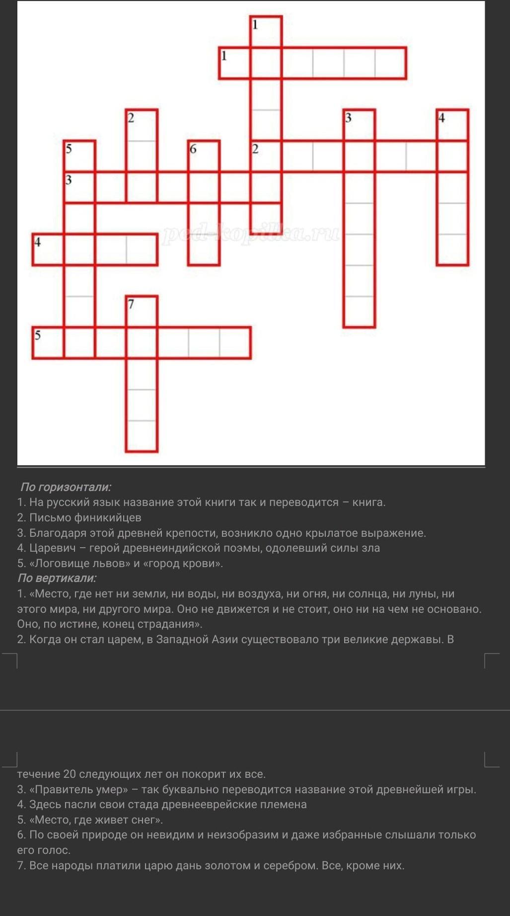 Ответ:По горизонтали: 1. Библия 2. Алфавит 3. Иерихон 4. Рабы 5. Ниневия.