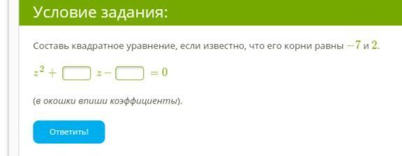 Составь квадратное уравнение, если известно, что его корни равны −7 и 2 z2+ z− =0 (в окошки впиши коэффициенты)