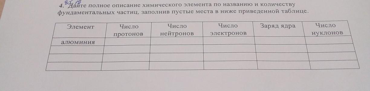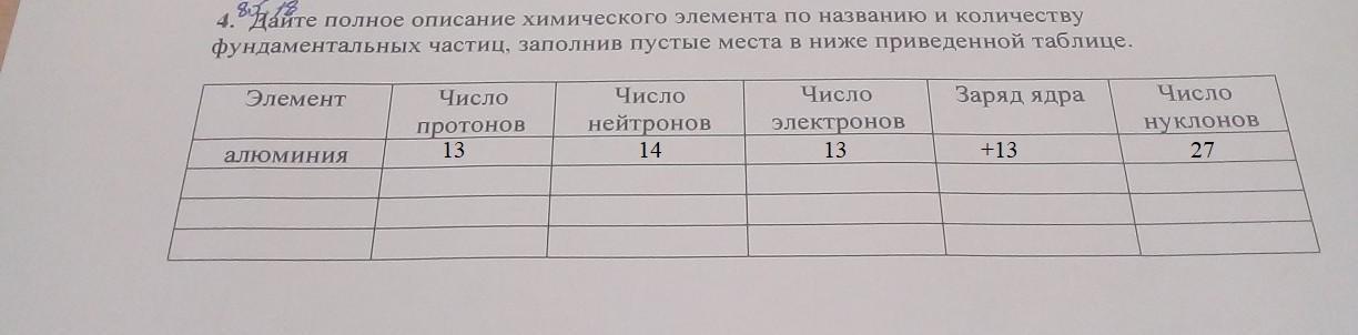 4. Дайте полное описание химического элемента по названию и количеству фундаментальных частиц, заполнив пустые места в ниже приведенной таблице.