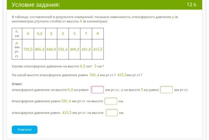 1) Атмосферное давление на высоте 0,2 км равно 665,2 мм рт. ст., а на высоте 5 км равно 489,2 мм рт. ст.