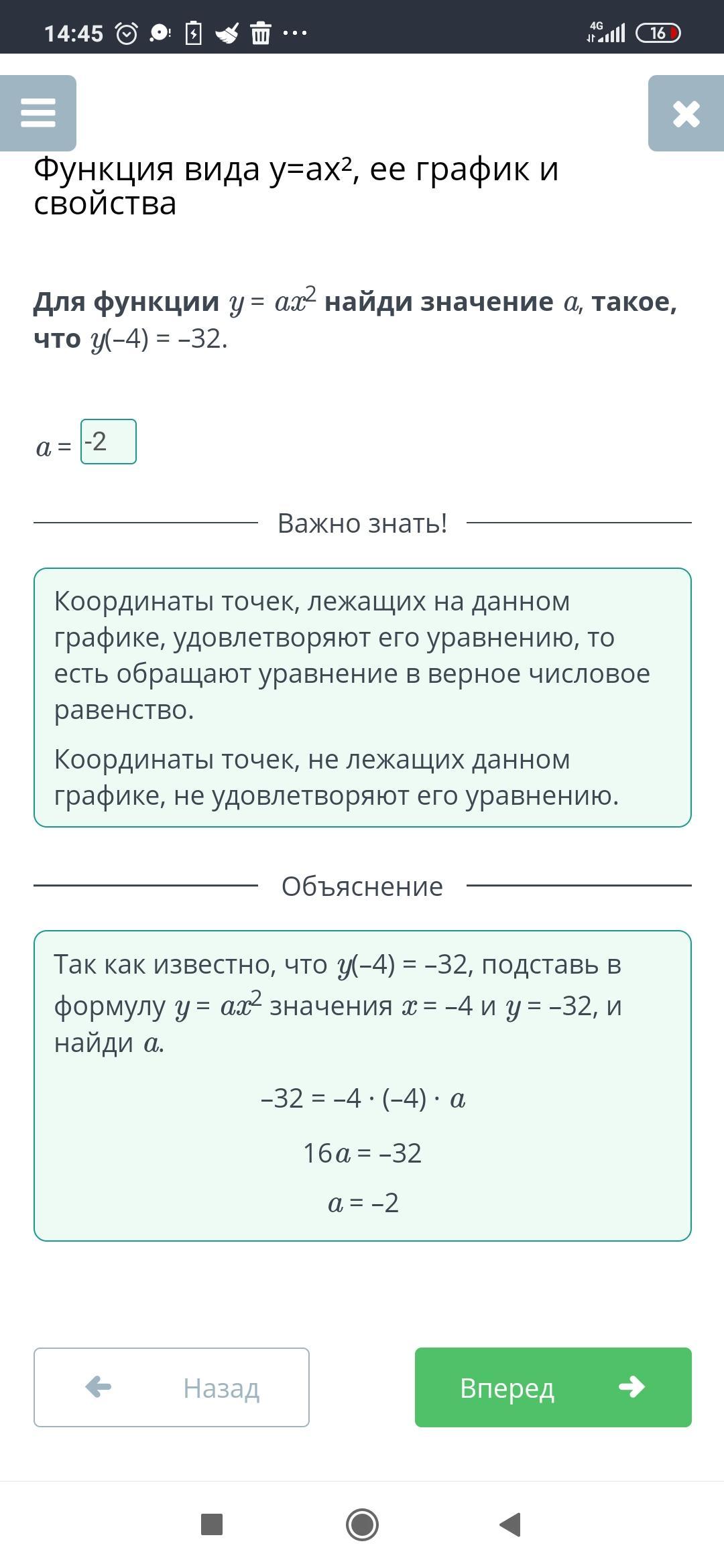 Для функции y = ax2 найди значение a, такое, что y(–4) = –32.
