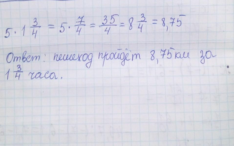 Какой путь пройдет пешеход со скоростью 5км/ч за 1 3/4