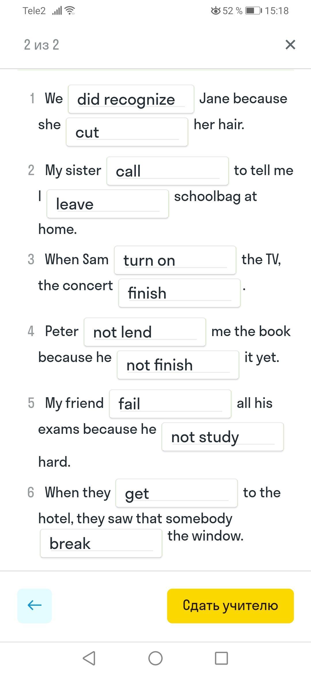 didn't recognize, had cut, called, had left, turned on, had finished, didn't lend, hadn't finished, failed, hadn't studied, got, had broken
