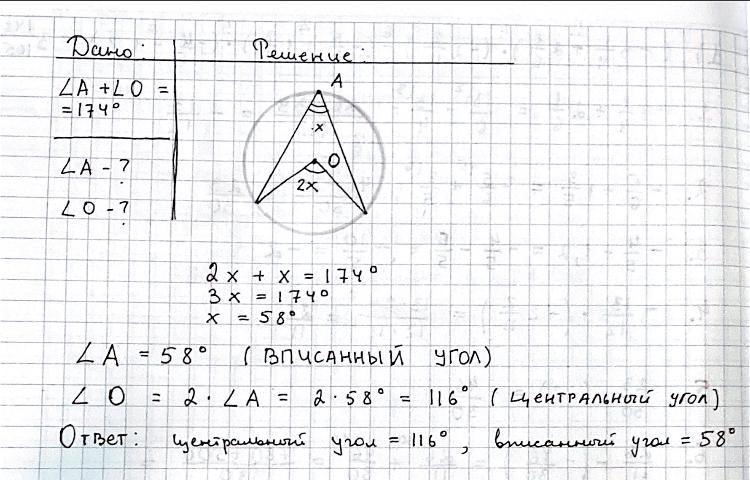 Объяснение: центральный угол в два раза больше вписанного угла, опирающегося на ту же дугу, что и центральный. Примем вписанный угол за «х», следовательно центральный угол = 2х. Составим уравнение: 2х+х= 174°. Решаем: х= 58° ( вписанный угол)