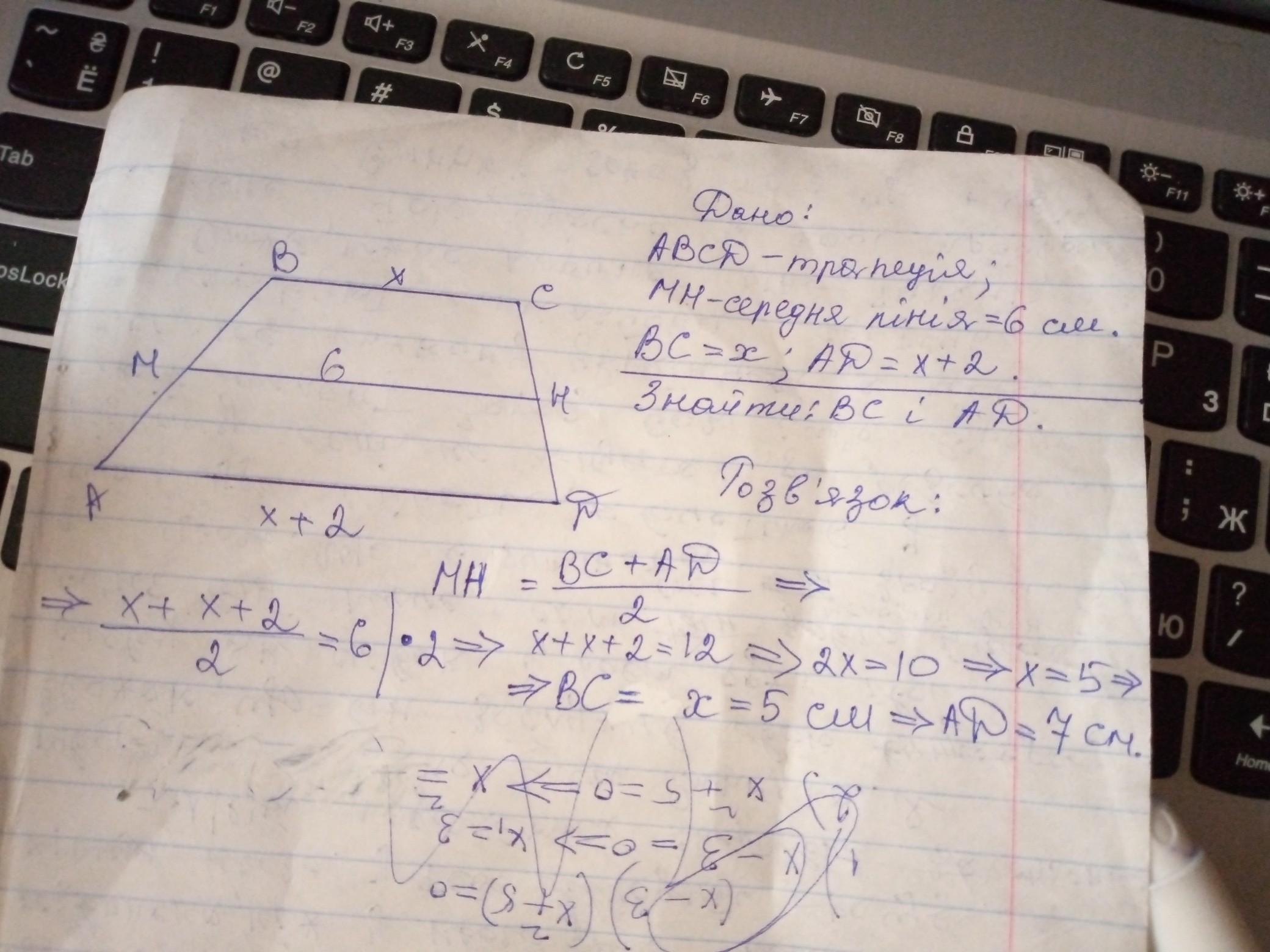 Середня лінія трапеції дорівнює 6 см. Знайдіть основи трапеції, якщо одна з них на 2 см менша від другої.