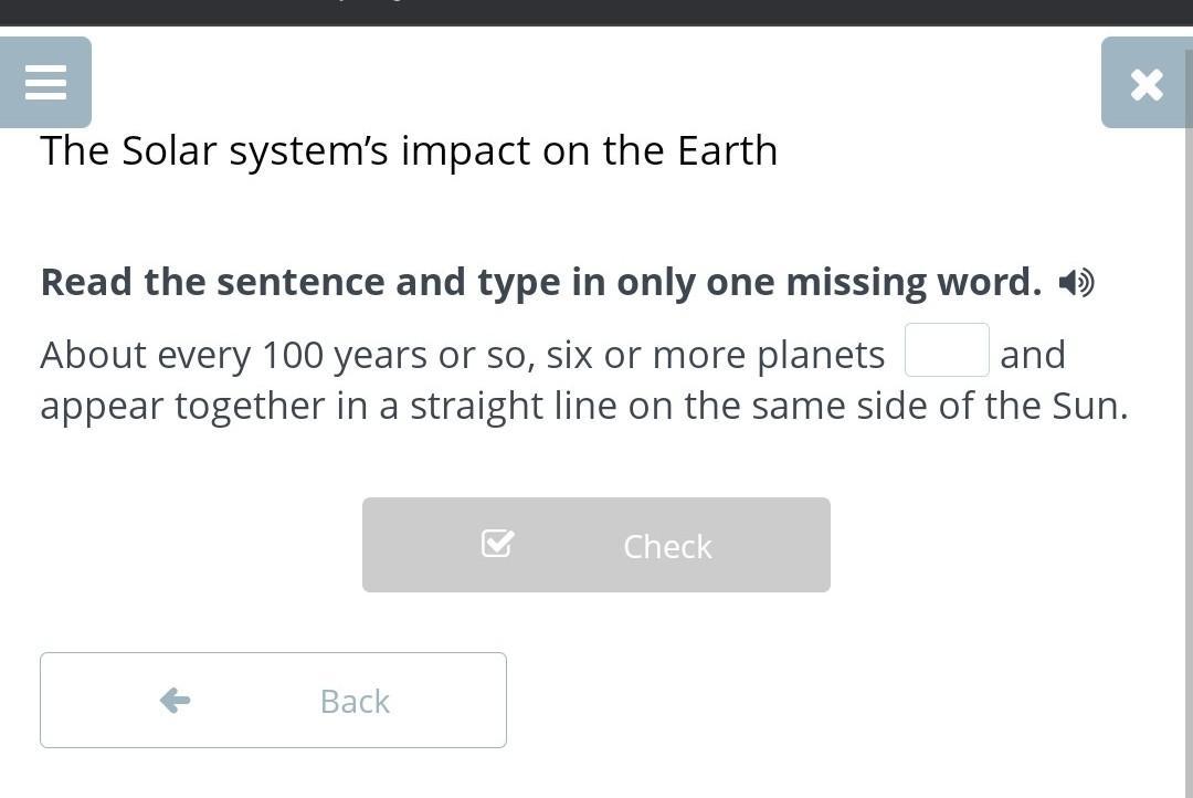 The Solar system’s impact on the Earth Read the sentence and type in only one missing word. About every 100 years or so, six or more planets and appear together in a straight line on the same side of the Sun.