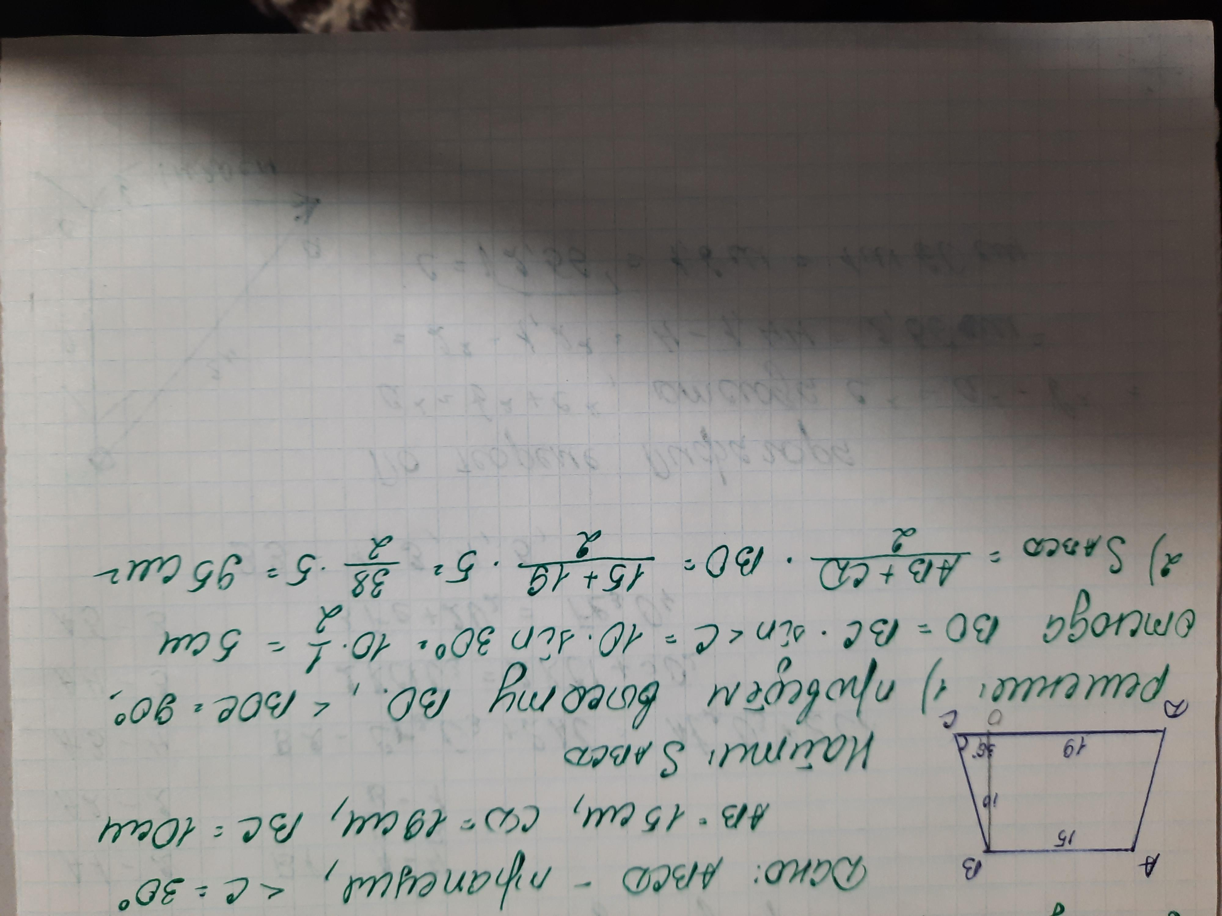 Найдите площадь трапеции ABCD с основаниями AB и CD, есдт AB=15см, CD=19см, BC=10см и угол C=30 градусов. Если можно, то сделайте чертёж