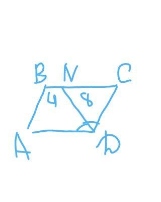 В параллелограмме ABCD биссектриса тупого угла D пересекает сторону BC в точке N, BN =4, NC=8. Чему равен периметр параллелограмма? (на листочке пожалуйста)