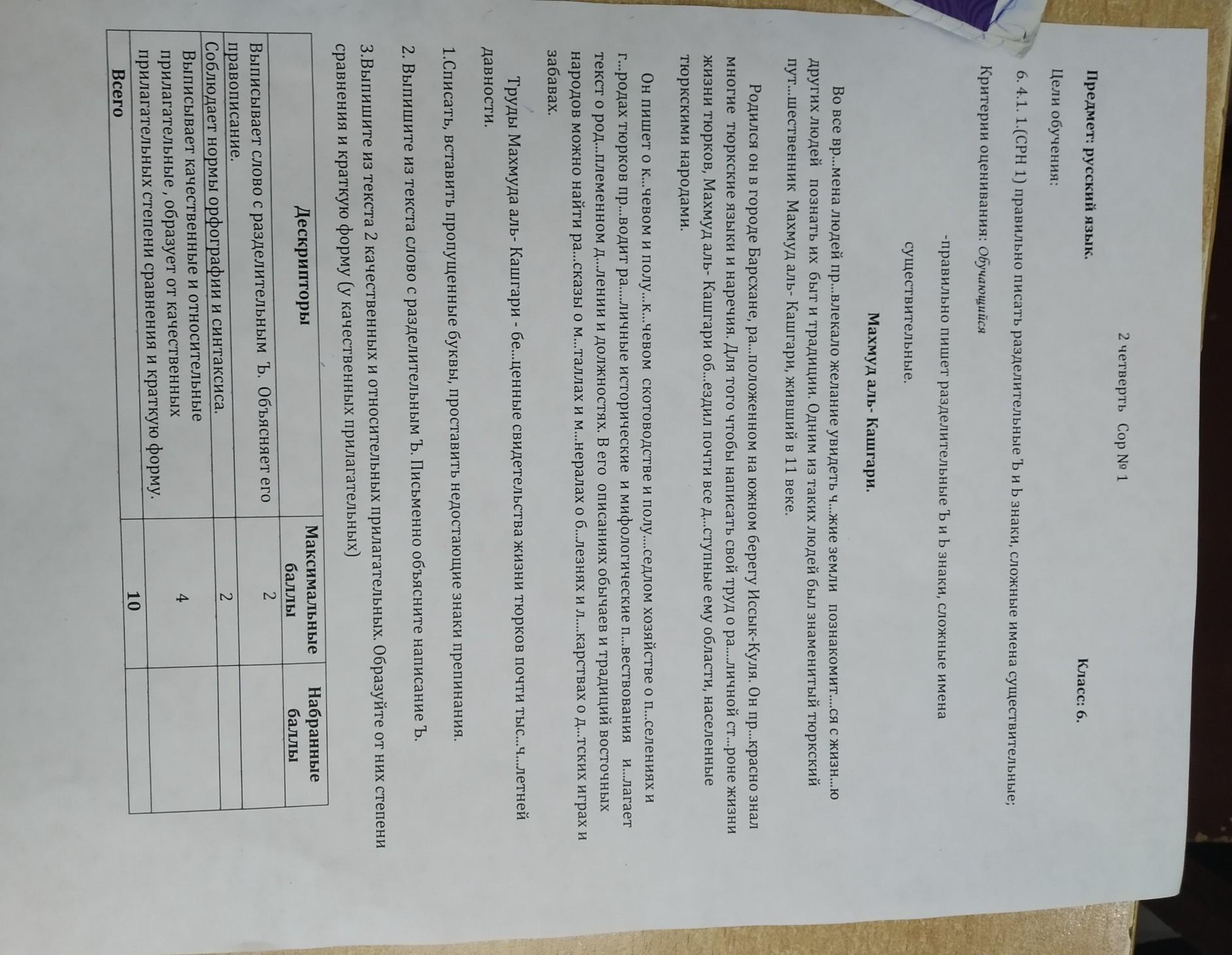 Во все вр.мена людей пр влекало желание увидеть ч.жие познакомит...ся с жизню других людей познать их быт и традиции. Одним изтаких людей был знаменитый тюркский путшественник Махмуд аль- Кашгари, живший в 11 веке. Родился он в городе Барсхане, ра положенном на южном берегу Иссык-Куля. Он пр.красно знал многие тюркские языки и наречия. Для того чтобы написать свой труд о ра.личной ст.роне жизни жизни тюрков, Махмуд аль- Кашгари обездил почти все д.ступные ему области, населенные тюркскими народами. Он пишет о к чевом полу.чевом скотоводстве и полу...седлом хозяйстве о п.селениях и Г.родах тюркон пр.водит ра.личные исторические и мифологические п... вествования илагает родплеменном Длении и должностях. В его описаниях обычаев и традиций восточных народов можно найти ра. сказы о м.. таллах и мнералах о 6. лезнях и л.карствах о д.тских играх и забавах. Труды Махмуда аль- Кашгари- бе.ценные свидетельства жизни тюрков почти тыс. летней давности. 1.Списать, вставить пропущенные буквы, проставить недостающие знаки препинания. 2. Выпишите из текста слово с разделительным Ъ, Письменно объясните написание "Ъ. 3.Выпишите из текста 2 качественных и относительных прилагательных. Образуйте от них степени сравнения краткую форму (у качественных прилагательных)