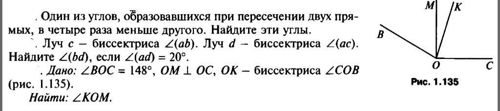 один из углов образовавшихся при пересечении двух прямых в 4 раза меньше другого найдите эти углы Луч C - биссектриса угла (ac), луч B- биссектриса угла (ac) Найти угол(bd) , если угол (ad)= 20. Дано угол BOC= 148°, OM и OC = смежные углы OK= биссектриса угла COB найти KOM