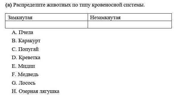 (b) Определите, каким животным соответствует следующее описание строения кровеносной системы: Сердце двухкамерное, имеется один круг крообращения________________________ (1 балл)