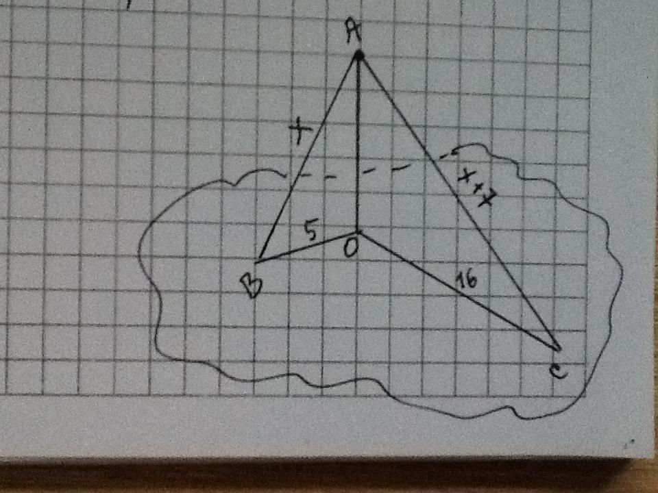 ΔАОВ та ΔАОС - прямокутні; ОВ=5 см, ОС=16 см.