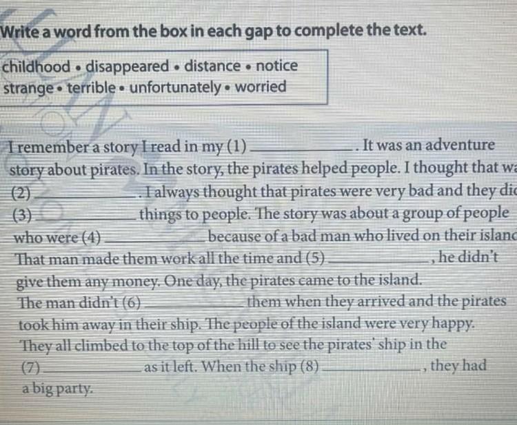 I remember a story I read in my childhood. It was an adventure story about pirates. In the story, the pirates helped people. I thought that was strange. I always thought that pirates were very bad and they did terrible things to people. The story was about a group of people who were worried because of a bad man who lived on their island. That man made them work all the time and unfortunately, he didn't give them any money. One day, the pirates came to the island. The man didn't notice them when they arrived and the pirates took him away in their ship. The people of the island were very happy. They all climbed to the top of the hill to see the pirates ship in the distance as it left. When the ship dissapeared, they had a big party.