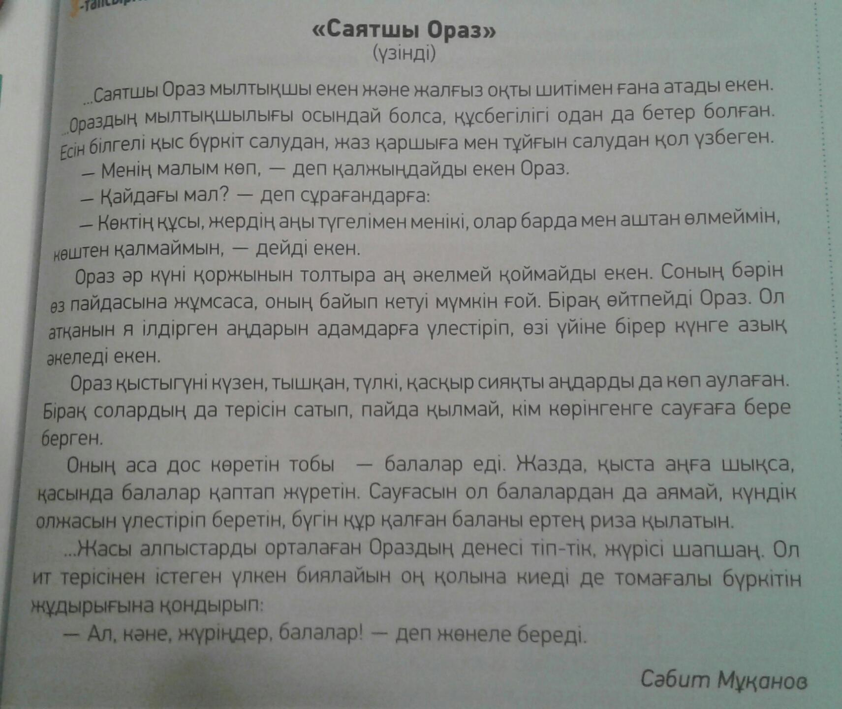 Оказывается, Ораз каждый день наполняет свою корзину. Если он потратит все это для своей выгоды, он может стать богатым. Но Ораз не говорит. Он раздавал выстрелы, которые стрелял, или ловил их и приносил домой еду на несколько дней.