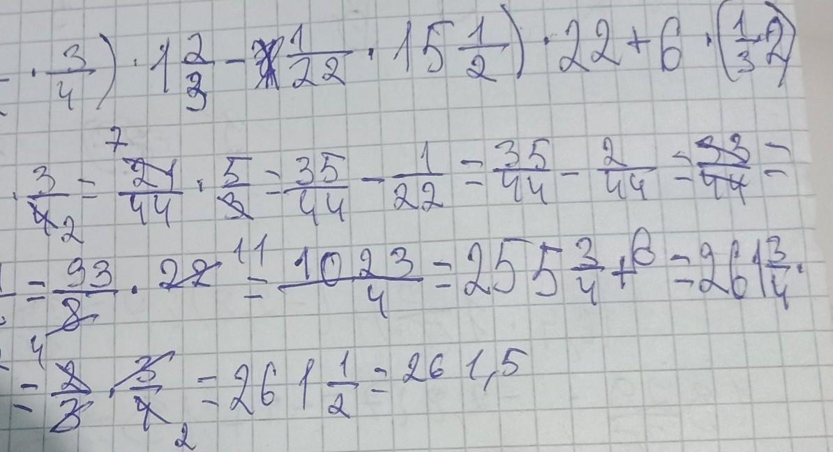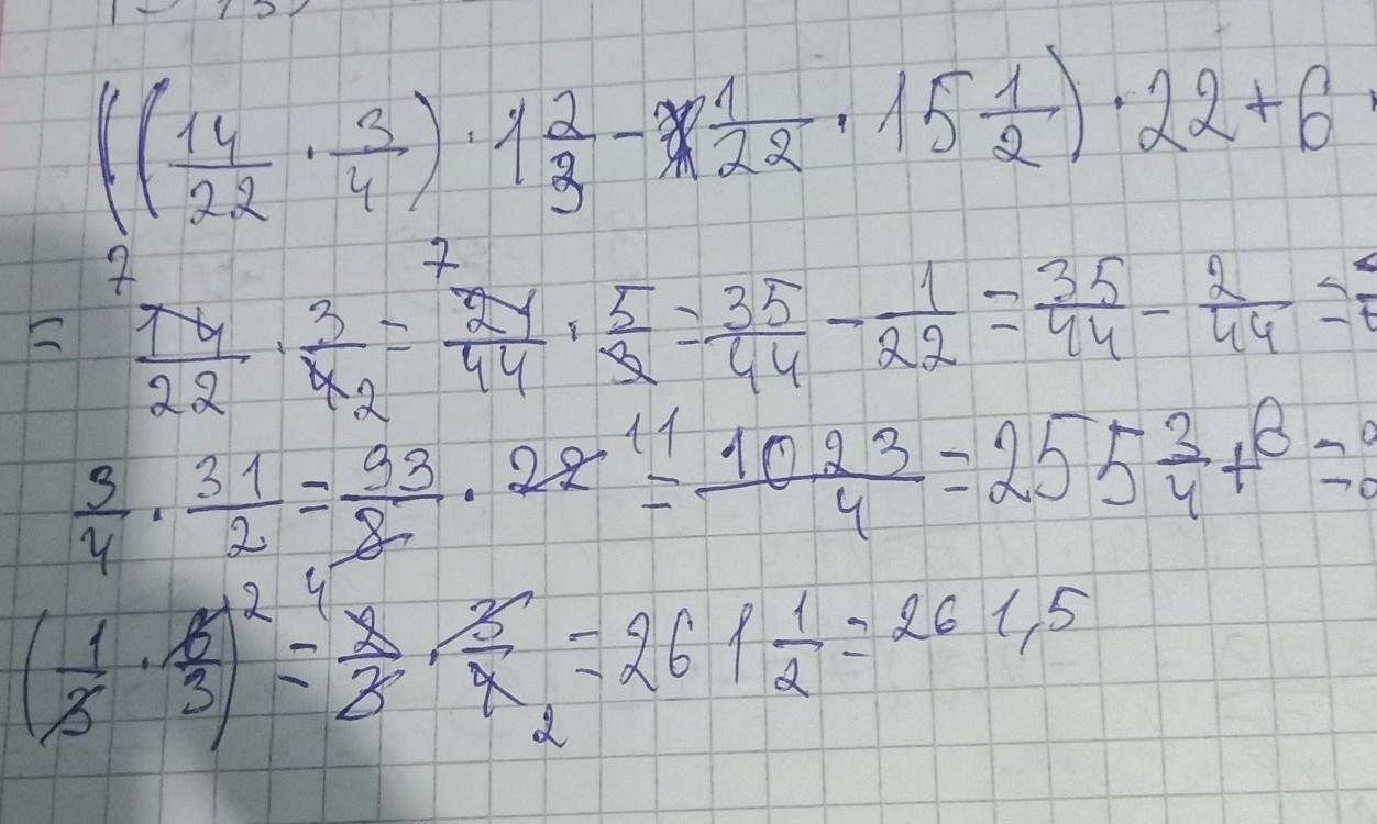((14/22•3/4)•1 2/3-1/22•15 1/2)•22+6•(1/3•2 1/2)помогите пожалуйста решить по действиям пж дам 20б