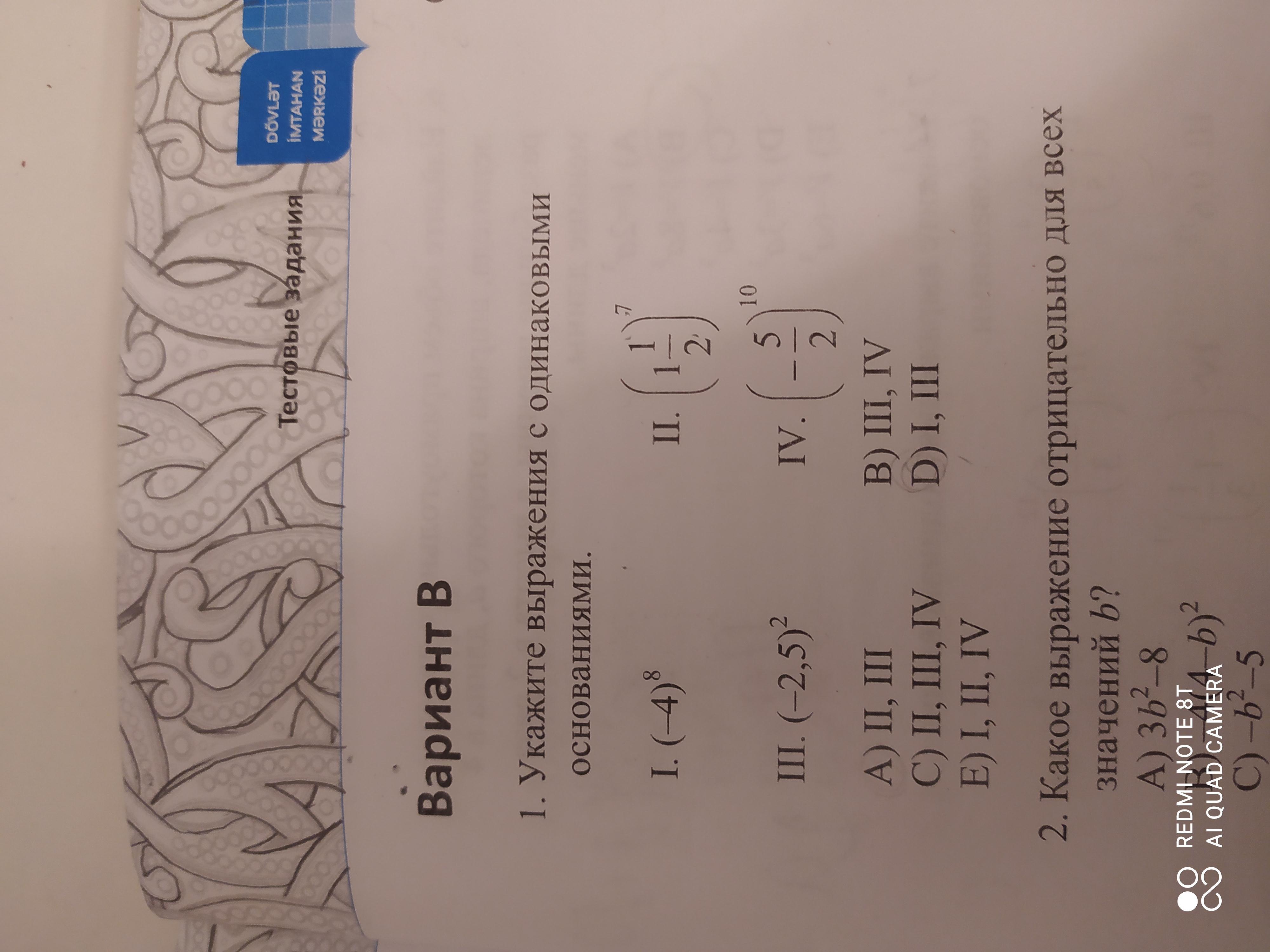 1. Укажите выражения с одинаковыми основаниями. 1)(-4)⁸ 2)(1 1/2)⁷ 3)(-2,5)² 4) (-5/2)¹⁰