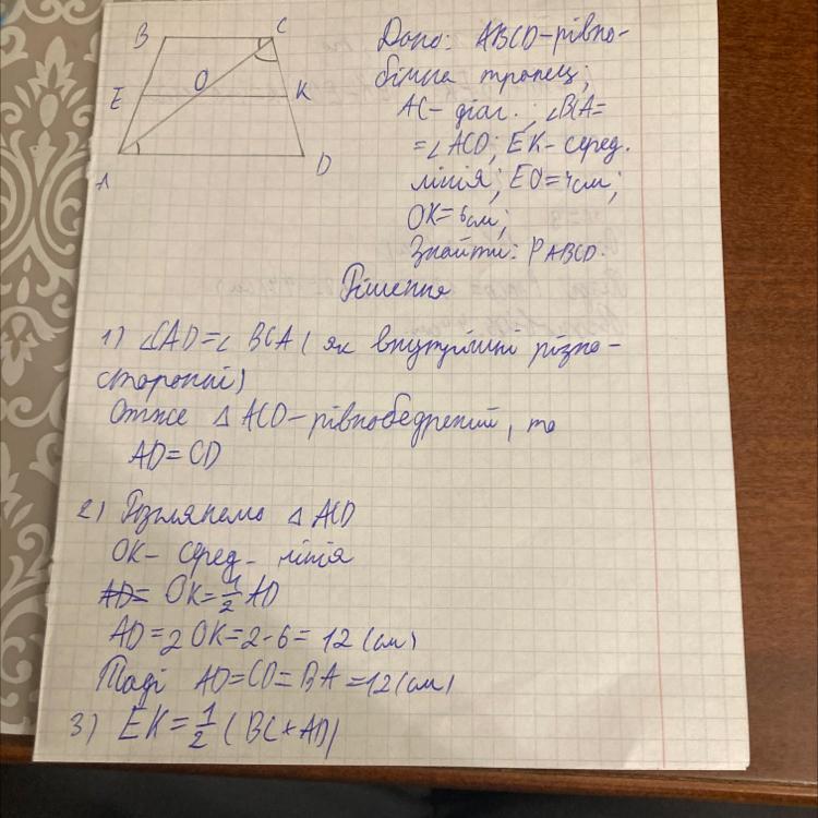 347. Діагональ рівнобічної трапеції ділить навпіл тупий кут трапеції, а її середню лінію – на відрізки 4 см і 6 см. Знайдіть периметр трапеції.