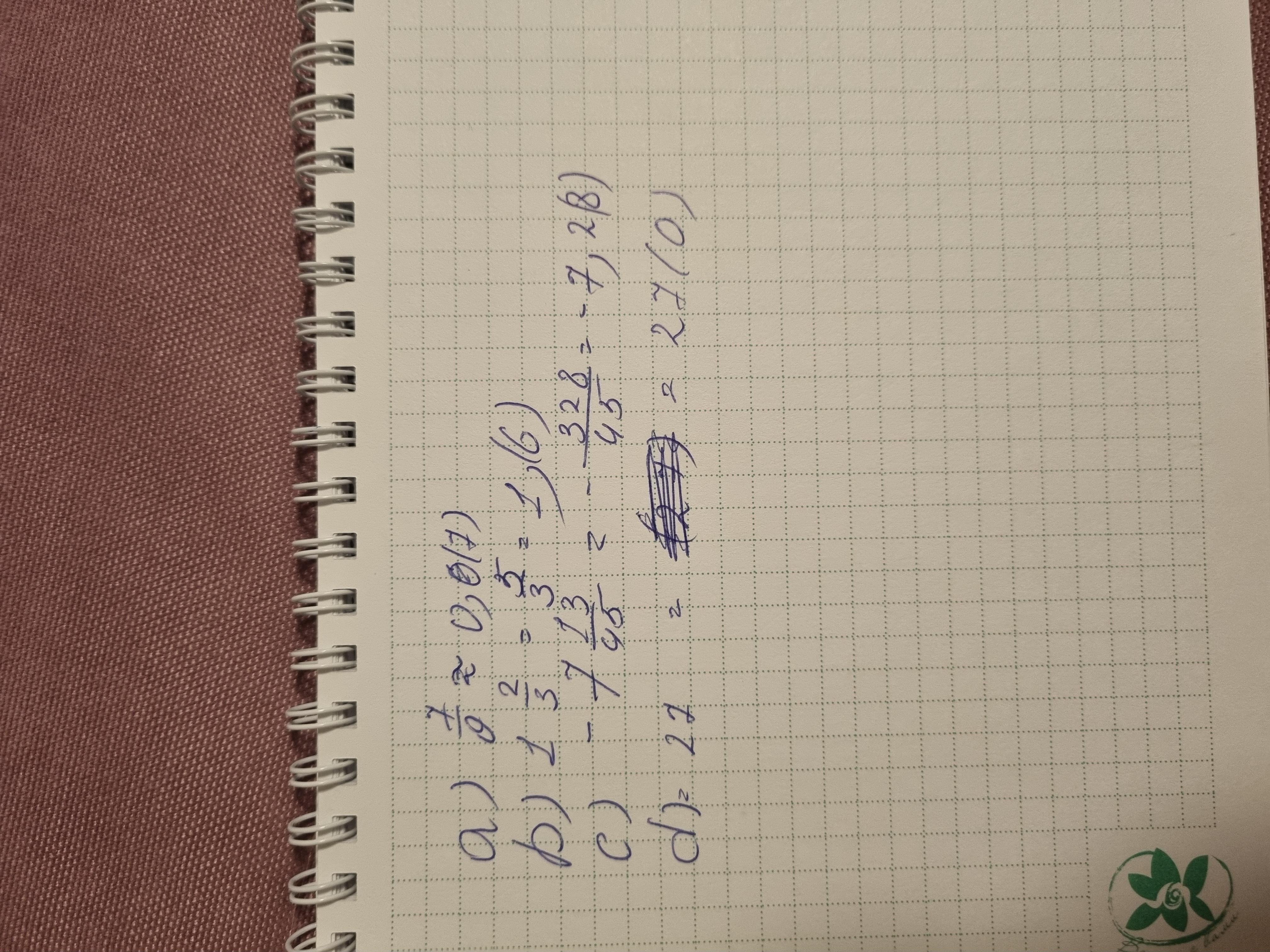представьте обыкновенные дроби в виде бесконечных периодических десятичных дробей: a)7/9 b)1. 2/3. c)-7 13/45. d)27