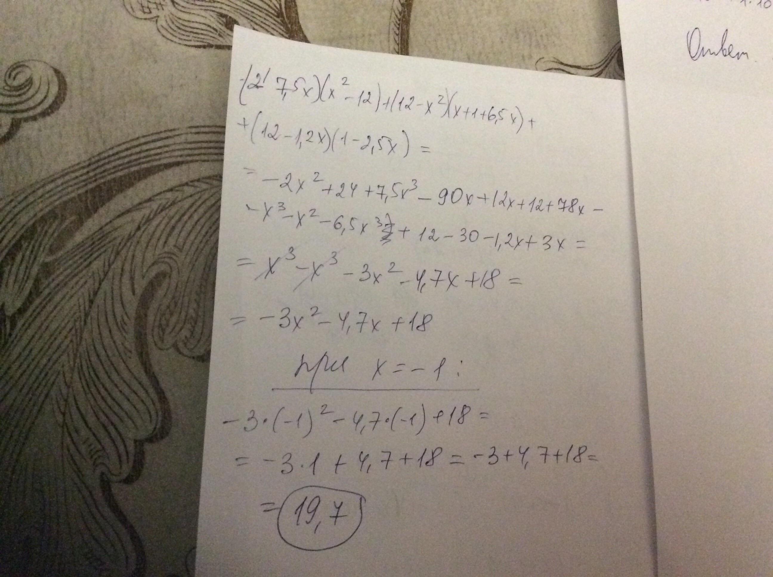 Найдите значения многочлена –(2 – 7,5x)(x2 – 12) + (12 — x2)(x + 1 + 6,5x) + (12 – 1,2x)(1 – 2,5x) при заданных значениях переменной x. Переменная x 4 –1
