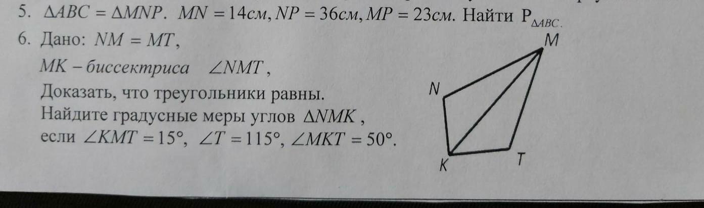 Треугольники MNK и MTK равны по 2 сторонам и углу между ними (MK - общая сторона, NM = MT по условию, угол KMN равен углу KMT, так как MK - биссектриса угла NMT). В равных треугольниках равны и соответствующие углы, значит угол KMN равен углу KMT и равен 15 градусам, угол N равен углу T и равен 115 градусам, угол MKN равен углу MKT и равен 50 градусам.