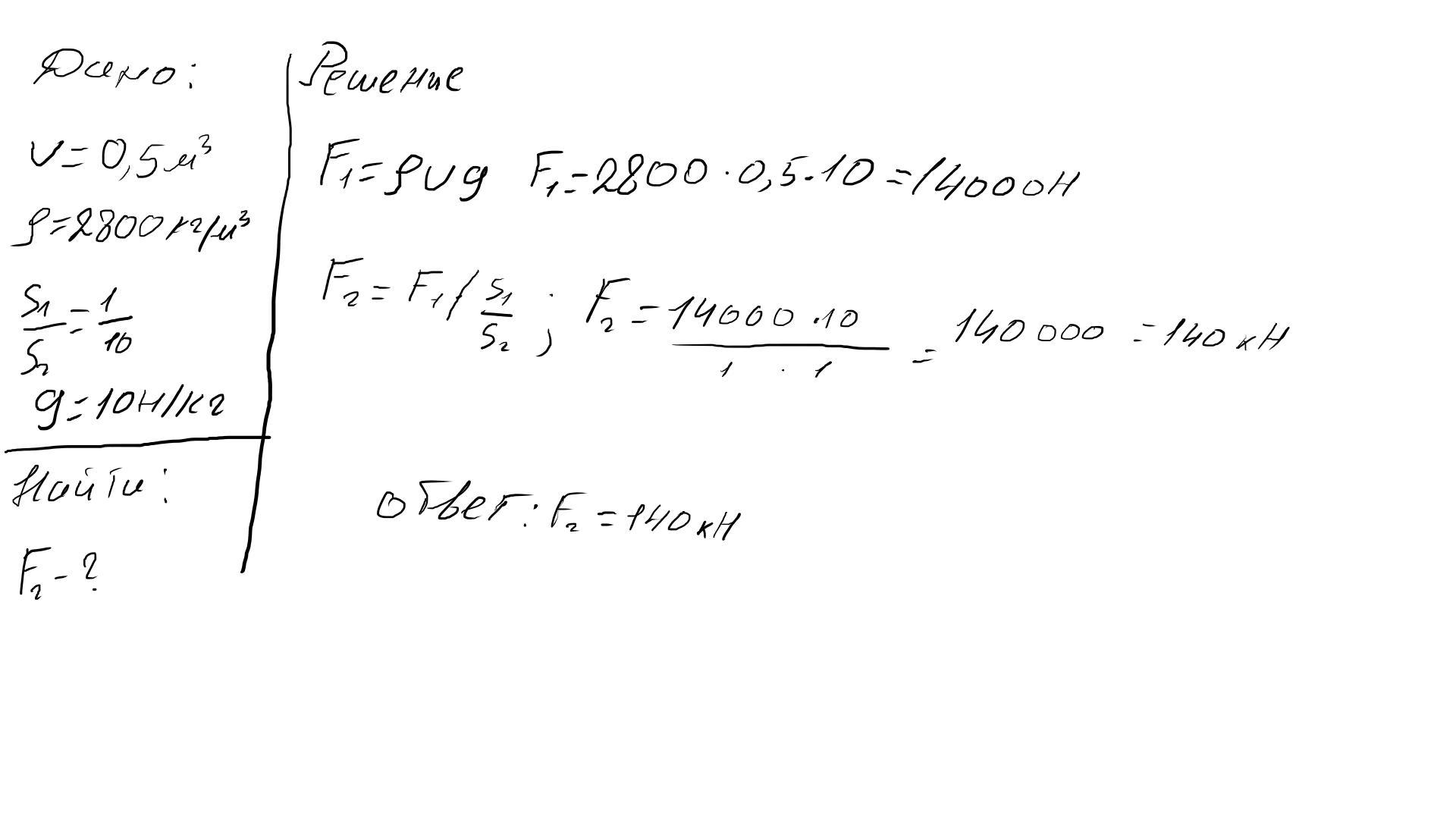 На меньший поршень гидравлического пресса положили тело объёмом 0,5 м³ и плотностью 2800 кг/м³ . Найдите силу , действующую на больший поршень, если его площадь в 10 раз больше площади меньшего поршня. Ускорение свободного падения 10 Н/кг