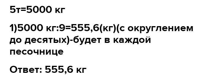 Во двор завезли 5 т песка. Его нужно распределить поровну на 9 песочниц. Сколько килограммов песка будет в каждой песочнице? Ответ запиши в виде десятичного приближения до десятых.