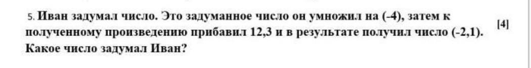 5. Иван задумал число. Это задуманное число он умножил на (-4), затем к полученному произведению прибавна 12,3 и в результате получил число (-2,1). Какое число задумал Иван?