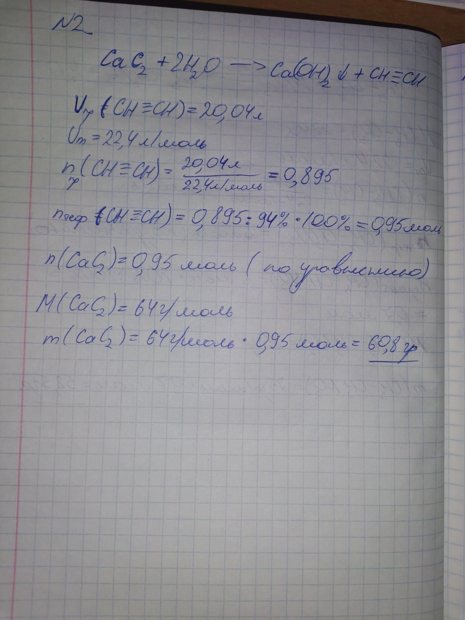 Масса карбида кальция, необходимого для получения 20,04 л. ацетилена с выходом 94%,