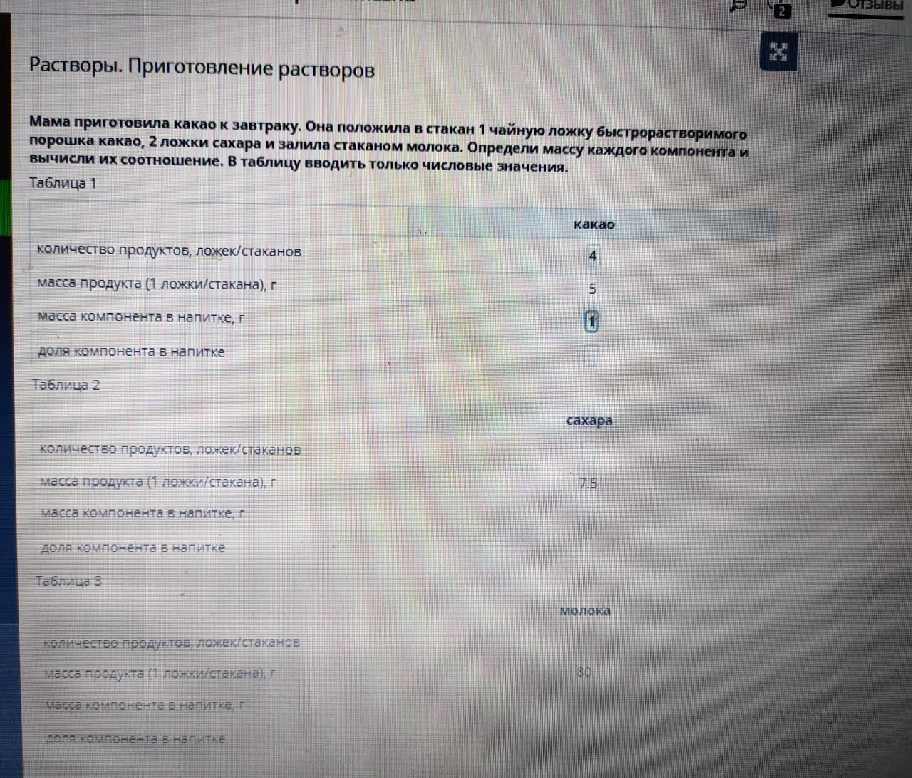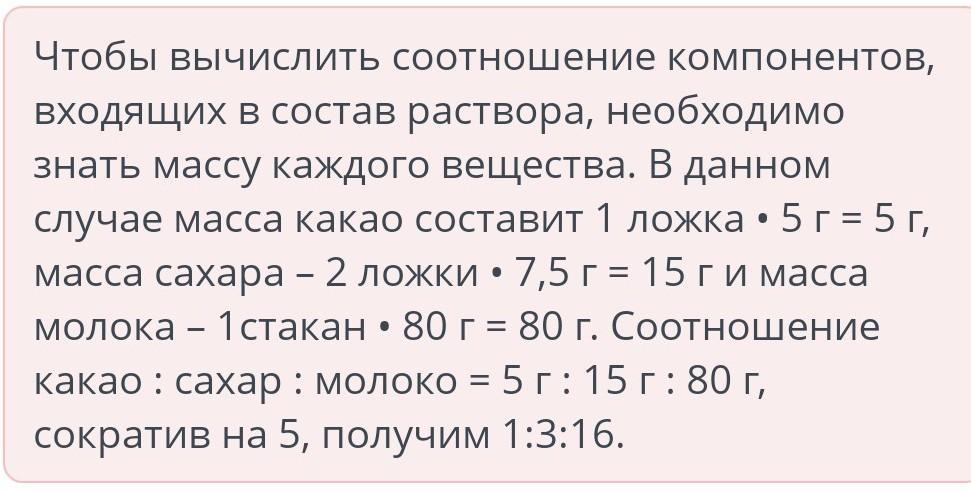 Мама приготовила какао к завтраку. Она положила в стакан 1 чайную ложку быстрорастворимого порошка какао, 2 ложки сахара и залила стаканом молока. Определи массу каждого компонента и вычисли их соотношение. В таблицу вводить только числовые значения.