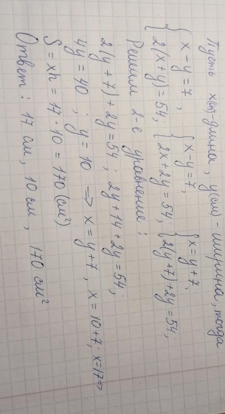 разность двух сторон прямоугольника равна 7 см а его периметр равен 54 см. Найдите стороны прямоугольника и его площадь!! пожалуйста!!!