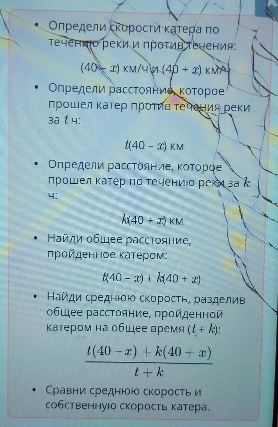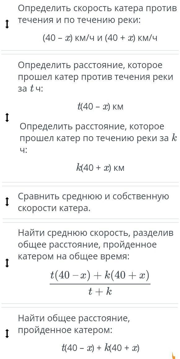 Катер проплыл t ч против течения и k ч по течению реки. Известно, что его скорость составляет 40 км/ч, а скорость течения реки – x км/ч. Определи правильный алгоритм для сравнения средней скорости и собственной скорости катера.