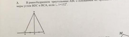 в равнобедреном треугольнике АВС с основанием АС проведена медиана ВD найдите градусную меру BDC и ВсА если L1=152 помогите пожалуйста дам 40 баллов