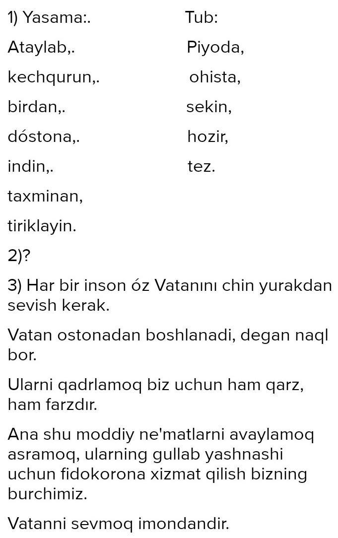 1. Biz bu yerga ... keldik. 2. Nozima bu chorakda barcha fanlardan ... harakat qildi. 3. Bobomlar non ushonqlarini ... terib oldilar. 4. Askar eshikni ... ochdi. 5. O'qituwchimiz uyga berilganvazifani ... so'radi. 6. Bulutlar ham ... pasaya boshladi. 7. Raketa Oyga ... qo'ndirildi