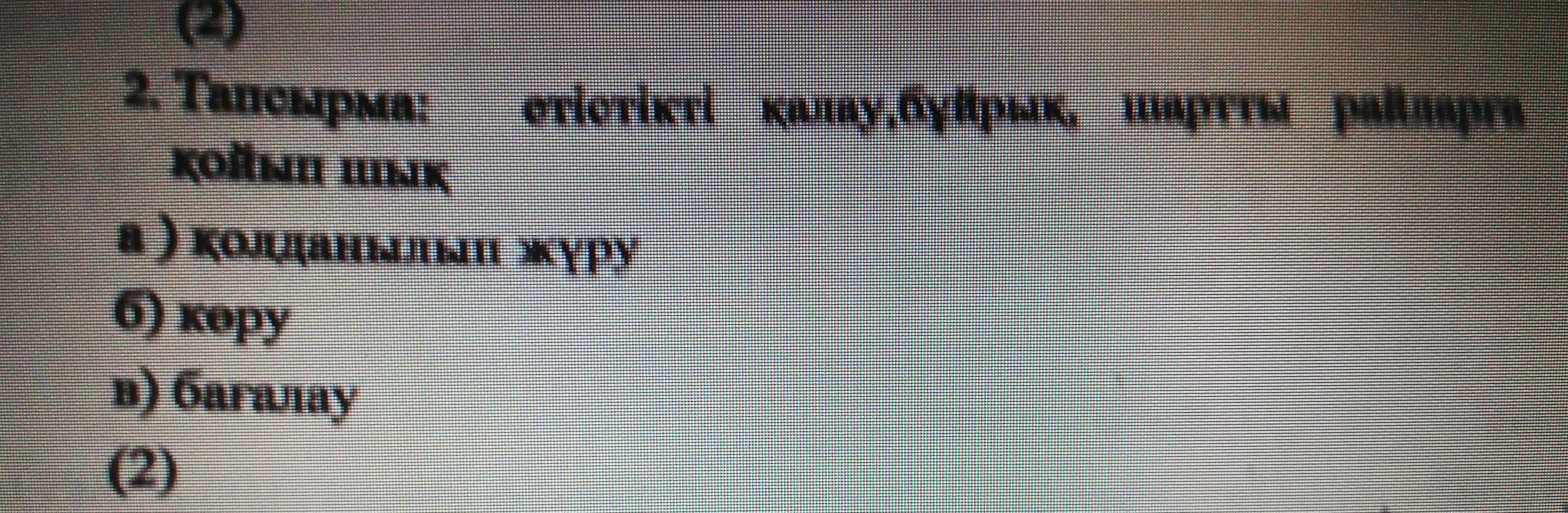 2 тапсырма : етістікті қалау, бұйрық шарты райларға қойып шық. а) қолданылып жүру. б) көру. в) бағалау