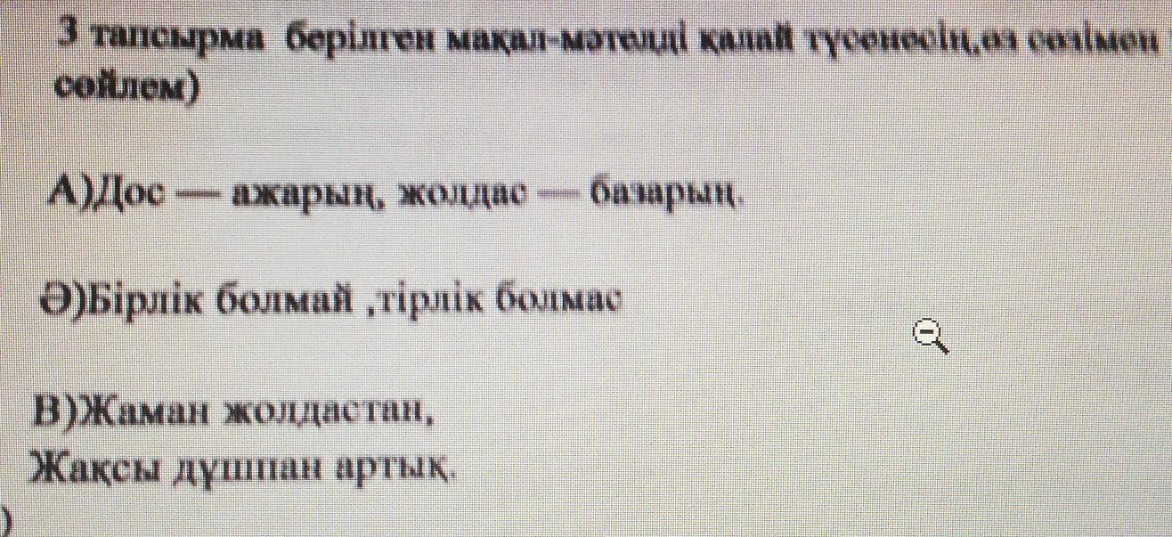 3 тапсырма берілген Мақал-мәтелдерді қалай түсенесің, өз сөзімен жаз (5-6 сөйлем) А) Дос-ажарың, жолдас - базаның. Ә) Бірлік болмай, тірлік болмас. В) Жаман жолдастан, жақсы дұшпан артық.