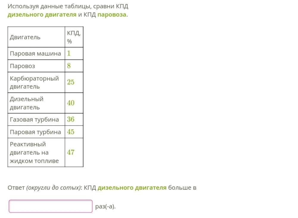 Ответ:кпд диз.дв. в 5 раз больше кпд паравоза