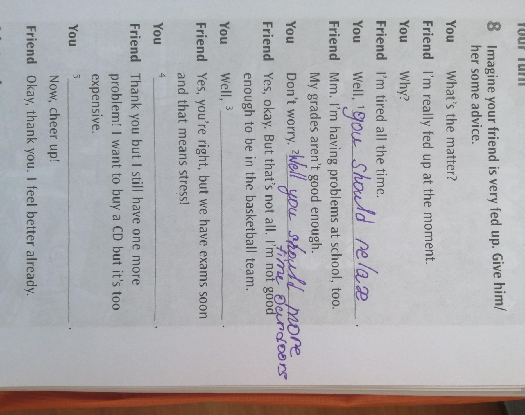 5 Your Turn 8 Imagine your friend is very fed up. Give him/ her some advice. You What's the matter? Friend I'm really fed up at the moment. You Why? Friend I'm tired all the time. You Friend Mm. I'm having problems at school, too. My grades aren't good enough. You should more Time Derdoors Friend Yes, okay. But that's not all. I'm not good enough to be in the basketball team. You Well, Friend Yes, you're right, but we have exams soon and that means stress! Well , you should relax Don't worry. Well you should 3 4 You ache Friend Thank you but I still have one more problem! I want to buy a CD but it's too expensive. You Now, cheer up! Friend Okay, thank you. I feel better already. 5 Listening