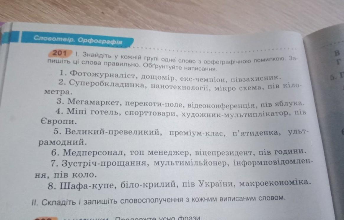 усі складноскорочені слова й похідні від них. Сюди належать і всі складні слова, першою частиною яких виступають компоненти: авія-, авто-, агро-, біо-, вело-, водо-, газо-, геліо-, гео-, гідро-, екзо-, екстра-, електро-, зоо-, ізо-, квазі-, кіно-, космо-, лже-, макро-, мета-, метео-, мікро-, мілі-, моно-, мото-, нео-, палео-, псевдо-, радіо-, рентгено-, соціо-, стерео-, супер-, теле-, термо-, турбо-, фоно-, фото-