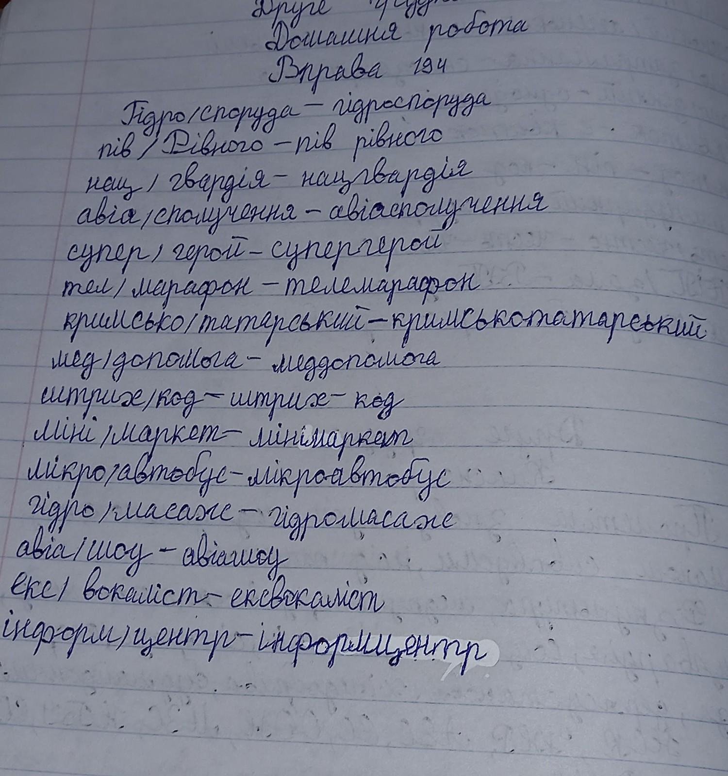 194 Спишіть слова, знявши риску. Розберіть за будовою виділені слова Гідро/споруда, пів/Рівного, нац/гвардія, авіа/сполучення, супергерой, теле/марафон, кримсько/татарський, мед/допо- мога, штрих/код, міні/маркет, мікро/автобус, гідро/масаж, авіа/шоу, екс/вокаліст, інформ/центр, електро/мобіль, дит'/ ясла, дит/майданчик, легко/атлетичний, озерно/болотний, аква/парк, пів/години, вебсайт.